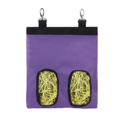 Purple hay bag with 2 holes made from tough 600D oxford material and has 2 clips to connect to a cage. The measurements are L28cm x H24cm and will open to 14cm. The top closes using a velcro strip.