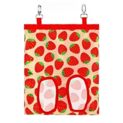 Strawberries hay bag with 2 holes made from oxford material and has 2 clips to connect to a cage. Great for keeping the cage clean and tidy